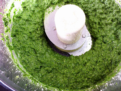 The first step is to make a super easy spinach pesto. I whirled together spinach, garlic, Parmesan, and olive oil in the food processor. I added just enough oil for the mixture to become an easily spreadable paste. The color is fabulous... and it doesn't oxidize like basil pesto does. Super excited about that!